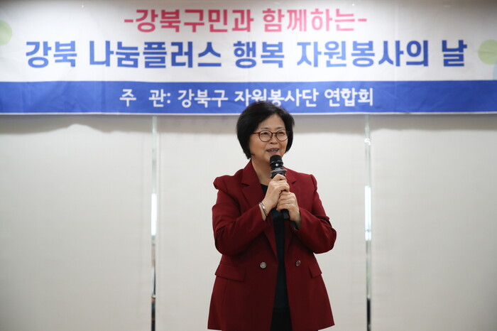 ▲ 이순희 강북구청장이 ‘강북 나눔플러스 행복 자원봉사의 날’ 행사에서 인사말을 전하고 있다. 강북구청 제공 |