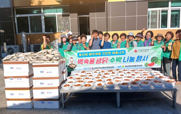 옥산면지역사회보장협의체는 옥산면사무소에서 오전 10시부터 생닭, 한방약재, 닭백숙 재료와 수박, 새마을부녀회에서 직접 재료를 준비하여 갓 담근 김치를 17개 마을의 24개 경로당에 전달했다.
