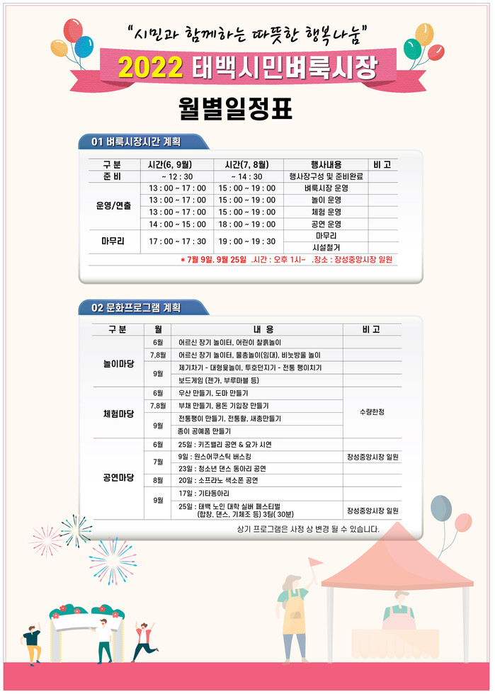 행사일정은 6월 25일, 7월 9일, 7월 23일, 8월 20일, 9월 17일, 9월 25일로 첫 번째 벼룩시장은 오는 25일 오후 1시 황지연못, 두 번째 벼룩시장은 7월 9일 장성중앙시장에서 열린다.