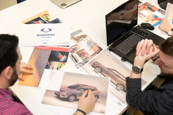 ▲지난 4월 쌍용차의 ‘티볼리 디자인 창작대회’에 참가한 SPD 대학원생들이 티볼리 디자인 창작대회 프로젝트에 참여해 아이디어를 논의하고 있다. |