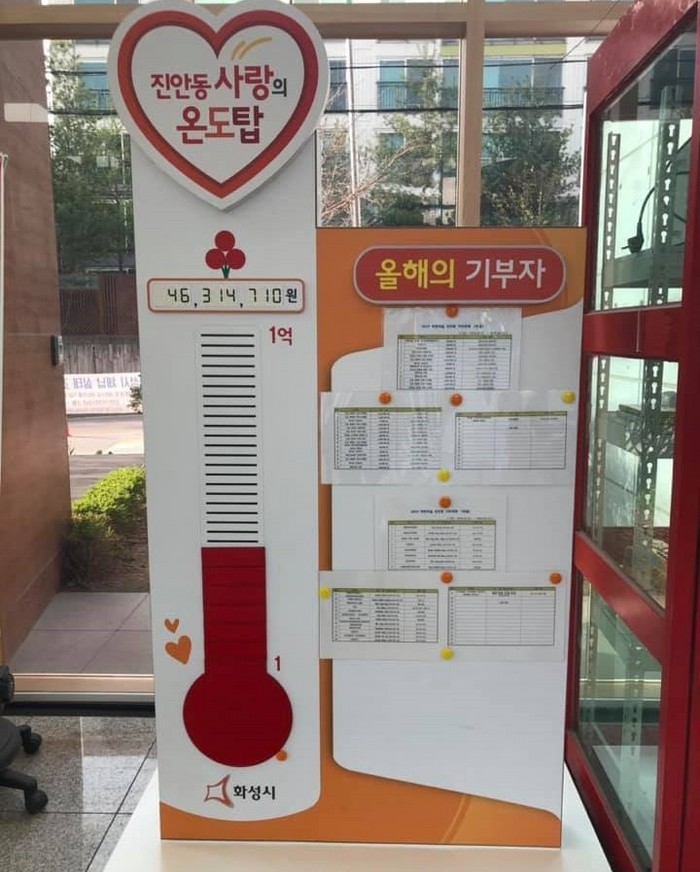 진안동 주민센터 로비에 설치된 사랑의 온도탑은 관내 현금 및 현물 기부자 등 후원자를 연중 수시로 기재해 후원에 대한 감사함과 이웃사랑 실천의 나눔문화를 확산시키고 있다.