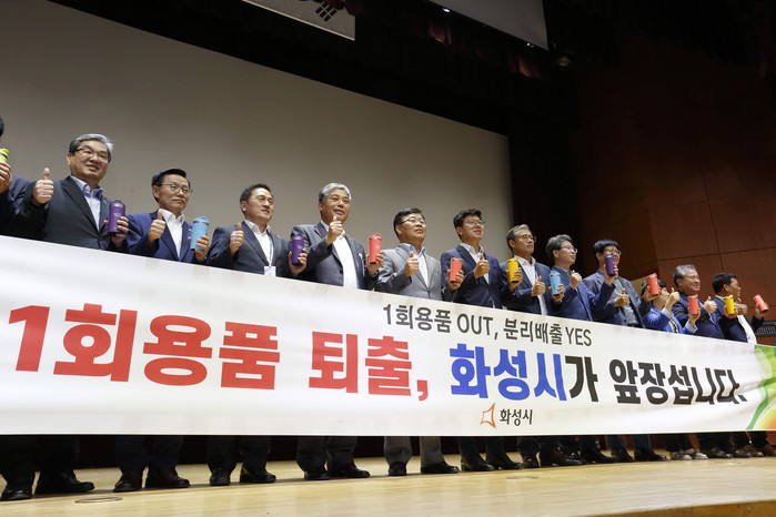 이날 화성시 부시장, 실국장, 과장 및 직원 30~50여 명은 개인 텀블러를 들고 올라 결의문 낭독 후 “ 1회용품 OUT, 분리배출 YES ” , “ 1회용품 줄이기, 화성시가 앞장섭니다.” 등 구호를 제창했다.