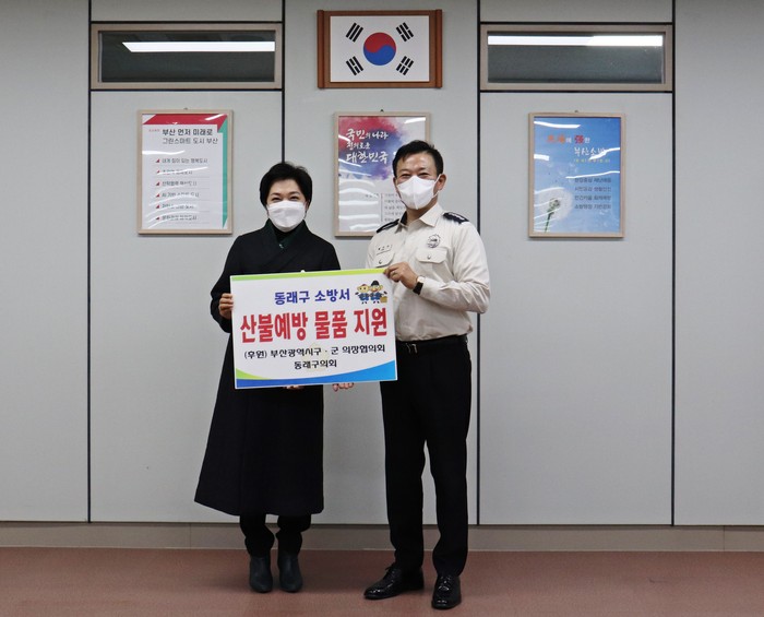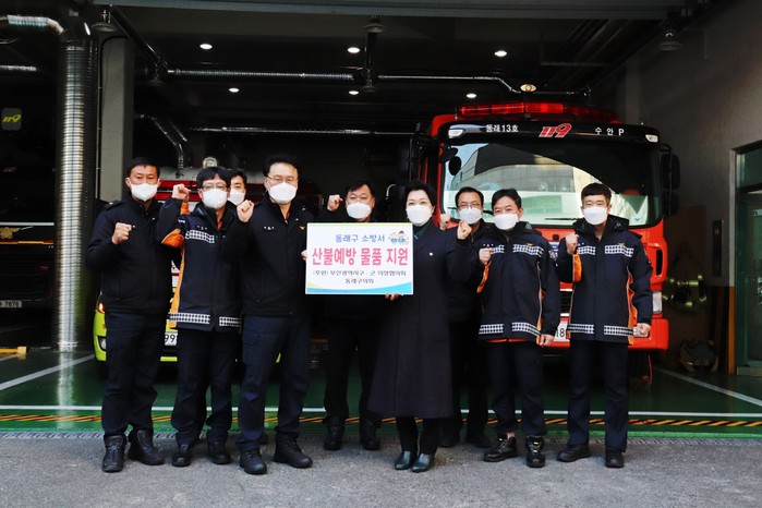 ▲배기수 동래소방서장과 주순희(왼쪽) 동래구의장이 '산불예방 물품 지원' 손팻말을 들고 기념촬영을 하고 있다. 동래소방서 제공 |