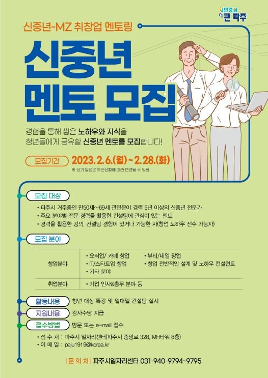 [로컬세계 = 이영원 기자]경기 파주시는 오는 28일까지 ‘신중년-MZ 취창업 멘토링 프로그램’에 함께할 신중년 멘토를 모집한다.