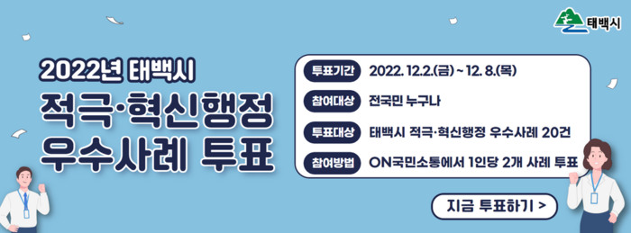 이번 온라인 투표는 온 국민소통 홈페이지 국민심사 항목에서 ‘2022년 태백시 적극·혁신행정 우수사례 투표’를 선택해 참여할 수 있다. 우수사례로 추천된 총 20건 중 2건을 선택해 투표하면 된다.