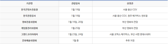 ▲‘콘텐츠 LIVE AID 1탄 – 애니플러스’ 행사 참여기관 및 상영일자.(한콘진 제공) |