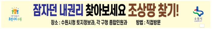 수원시는 수원종합운동장·기업은행 동수원지점 앞·수원역사 육교 등 20개소에 ‘조상 땅 찾기’를 홍보하는 현수막을 게시하고, 홍보에 적극적으로 나서고 있다.