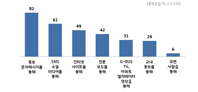 또 수혜자들은 효과적인 홍보방법으로 ‘한국장학재단의 홍보 문자메시지’(82%)를 가장 높게 꼽았고, 그 다음으로 ‘SNS 소셜미디어’(61%), ‘인터넷 사이트’(49%), ‘언론 보도를 통해’(42%) 등의 순으로 응답했다.