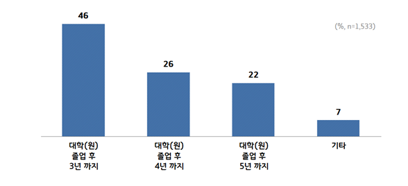 이밖에 현행 졸업 후 2년 이내인 지원기간을 확대할 경우 적정기간에 대해서는 ‘대학(원) 졸업 후 3년’(46%)을 가장 많이 꼽았다. ‘졸업 후 4년’은 26%, ‘졸업 후 5년’은 22%였다.