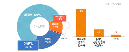 이번 지원 신청은 홈페이지를 통해서만 가능했는데, 온라인 신청절차에 대해서 수혜자 대부분(87%)이 ‘쉬웠다’는 반응이었다.
