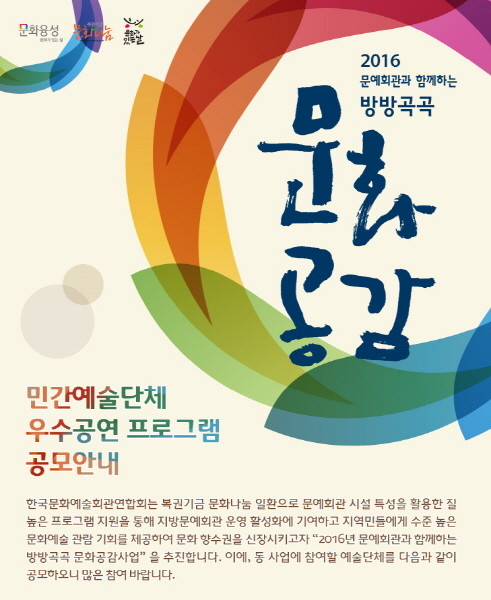 ▲ ‘2016 문예회관과 함께하는 방방곡곡 문화공감’민간예술단체 우수공연 프로그램 공모 안내 포스터 <사진제공=한국문화예술회관연합회> |