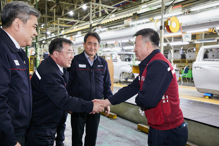 ▲예병태 신임 사장이 지난 1일 오전 취임식 직후 쌍용차 평택공장 생산현장을 둘러보며 현장직원들과 반갑게 인사를 나누고 있다. |