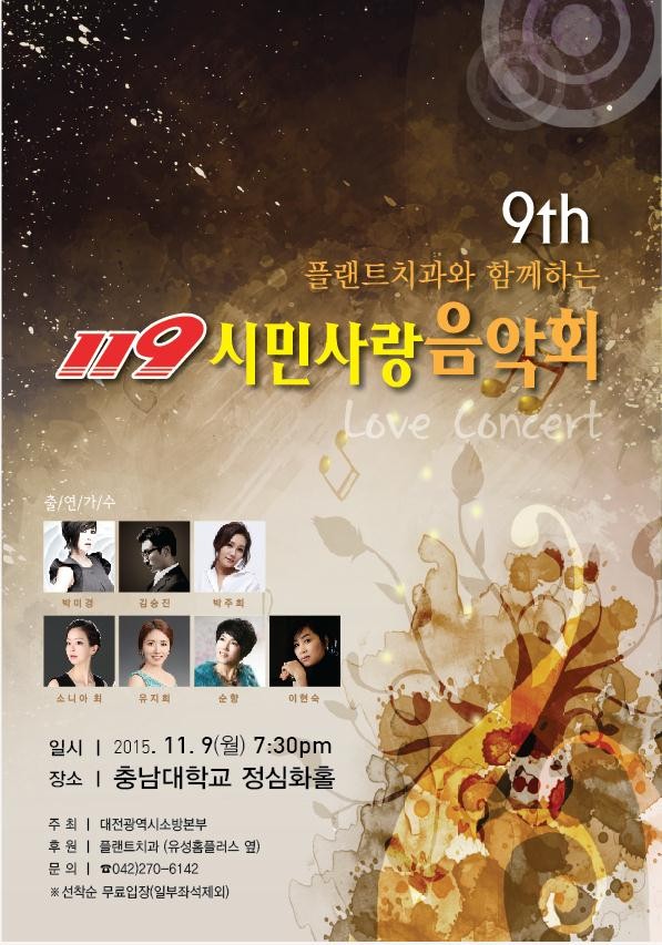 119시민사랑음악회는 긴급출동으로 몸과 마음이 지쳐있는 소방공무원들에게 감사한 마음을 전하고 시민과 함께 안전문화 축제의 장을 마련하기 위해 플랜트치과 후원으로 이뤄지고 있다.