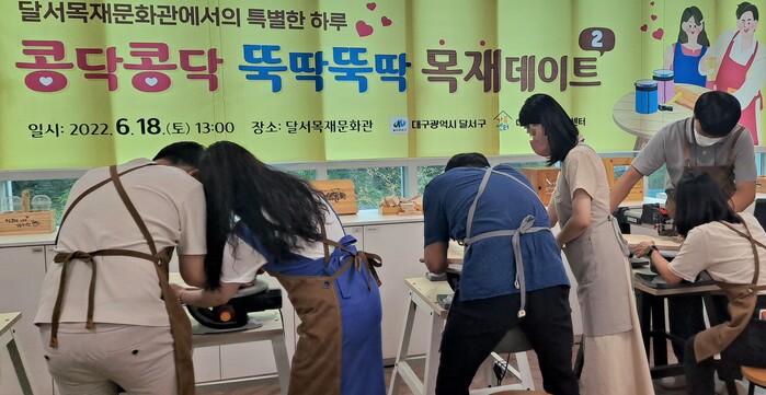 한 참여자는 ‘편백나무 등의 목재향이 가득한 달서목재문화관에 들어서니 힐링이 되는 느낌을 받았으며, 남녀가 서로 도와가며 도마를 만들며 자연스럽게 가까워지는 이색적 만남프로그램이 인상적이었다.’고 말했다.