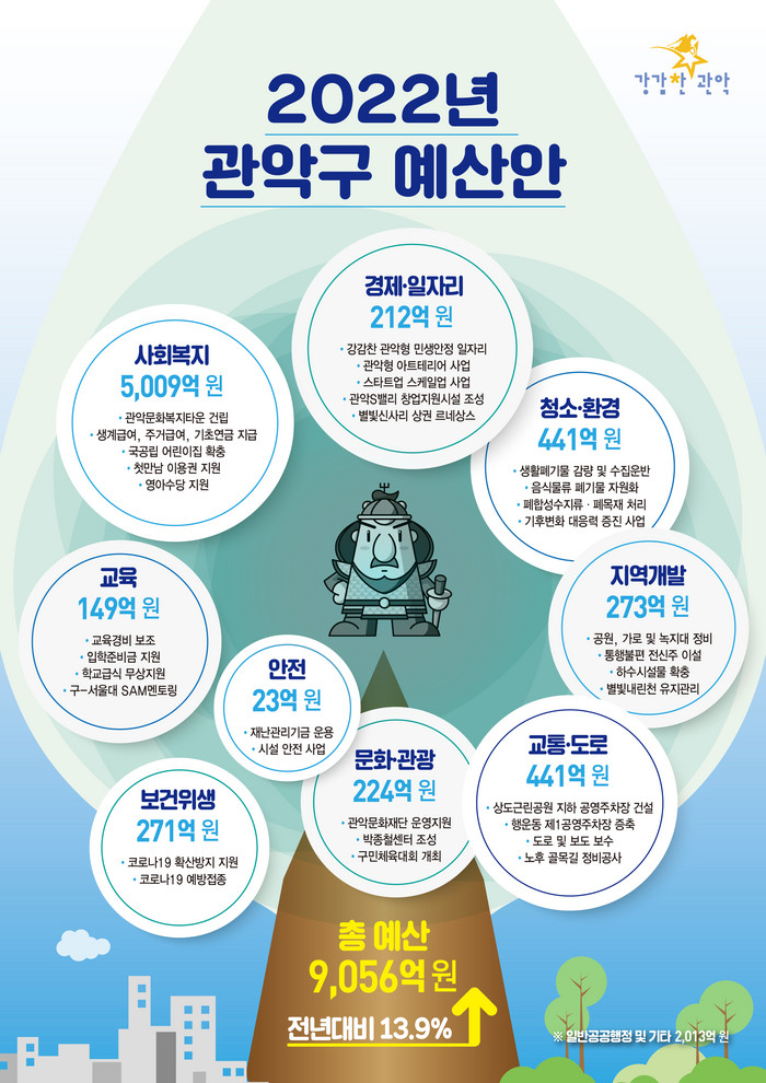 청소·환경 분야는 올해 대비 20% 증가한 441억 원을 편성했으며, 문화·체육 분야는 ▲관악문화재단 운영(97억2,200만 원), ▲구민체육대회 개최(2억500만원) 등 224억 원을 편성했다.