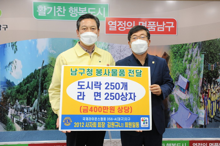 [로컬세계 박세환 기자]대구 남구는 지난 25일, 국제라이온스협회 356-A(대구)지구 2012 사자회(회장 김원규L 외 회원)에서 코로나19 극복을 위해 도시락 250개와 라면 250상자(400만원 상당)를 전달했다고 26일 밝혔다.