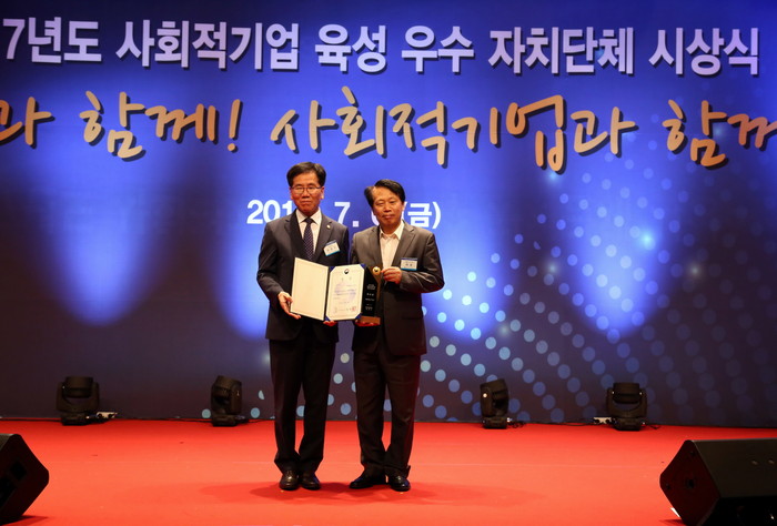 ▲서울 구로구는 지난 6일 여의도 중소기업중앙회 그랜드홀에서 열린 고용노동부 주관 ‘2017 사회적기업 육성 성과공유대회’에서 우수기관에 선정돼 우수상을 수상했다.(오른쪽부터 이성 구로구청장, 이성기 고용부 차관)/(구로구 제공) |