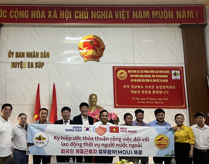 한편, 의성군은 2019년 캄보디아 노동직업훈련부, 2022년 필리핀 시닐로안시, 2024년 필리핀 리바카우시와 업무협약을 체결하였고 이번 베트남 에아숩현과의 업무협약을 체결함으로써 외국인 계절근로자 도입 다각화를 꾀한다.