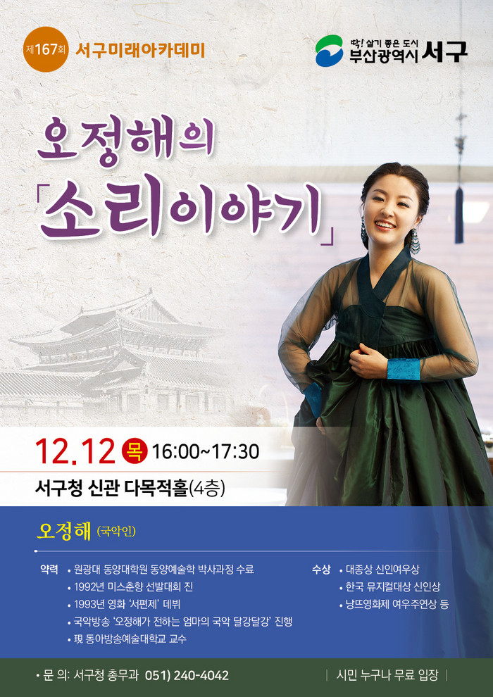 이번 강연은 국악인 오정해씨를 초청하여 ‘오정해의 소리이야기’ 라는 주제로 국악인으로서 살아온 자신의 이야기를 신명나는 판소리와 함께 흥겹게 전달할 예정이다.