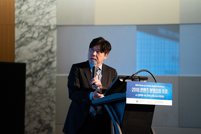 ▲지난 23일 인터컨티넨탈 서울 코엑스에서 열린 ‘2018 콘텐츠 분쟁조정 포럼’에서 법무법인 지평 최승수 변호사가 주제 발표를 하고 있다. |