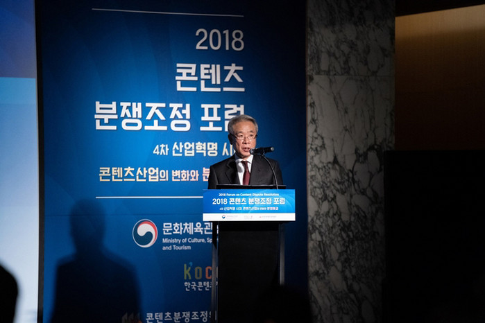 ▲지난 23일 인터컨티넨탈 서울 코엑스에서 열린 ‘2018 콘텐츠 분쟁조정 포럼’에서 한국콘텐츠분쟁조정위원회 백윤재 위원장이 개회사를 하고 있다. |