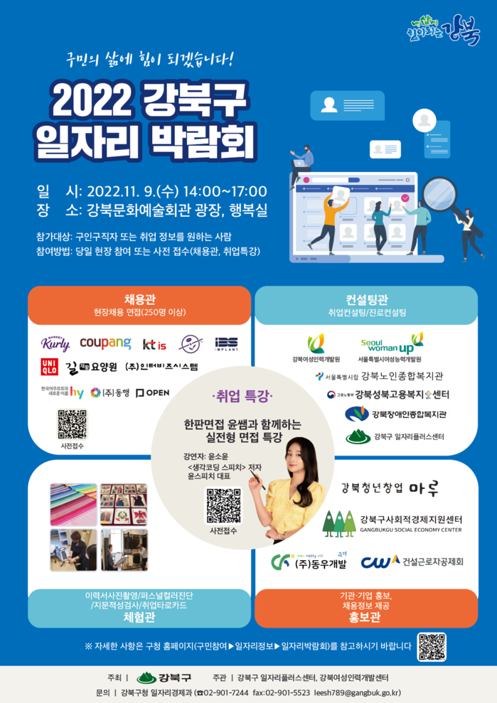 구직자 또는 취업 정보를 원하는 사람이라면 누구나 일자리박람회에 참여할 수 있다. 기타 자세한 사항은 강북구 홈페이지에서 확인하면 된다.
