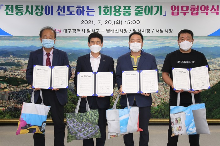 [로컬세계 박세환 기자]대구 달서구는 지난 20일 구청 5층 회의실에서 월배·달서·서남 전통시장 상인회 3곳과 일회용품 사용을 줄이고 환경보전을 위해 ‘전통시장이 선도하는 1회용품 줄이기’실천 상호 협약을 체결했다고 21일 밝혔다.