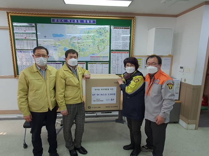 군산시는 시의용소방대연합회(회장 장병수, 문현순)가 지난 13일 농어촌 안전취약계층을 대상으로 코로나19 극복을 위한 마스크 3000매를 기탁했다고 14일 밝혔다.
