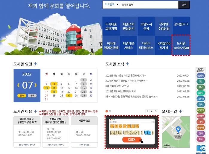 ▲창원중앙도서관 도서관 둘러보기(VR) 위치 및 화면(홈페이지). 창원특례시 제공. |