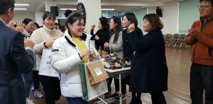 ▲장성여고 수험생들에게 합격을 기원하는 선물을 전달하고 있다. |