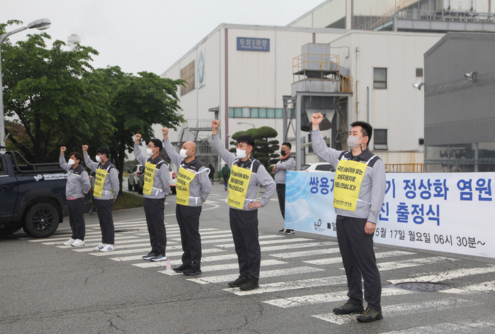 ▲쌍용자동차노동조합 임원단이 17일 오전 쌍용자동차 평택공장 정문에서 조합원들과 함께 도보행진 출정식을 가지고 있다. |