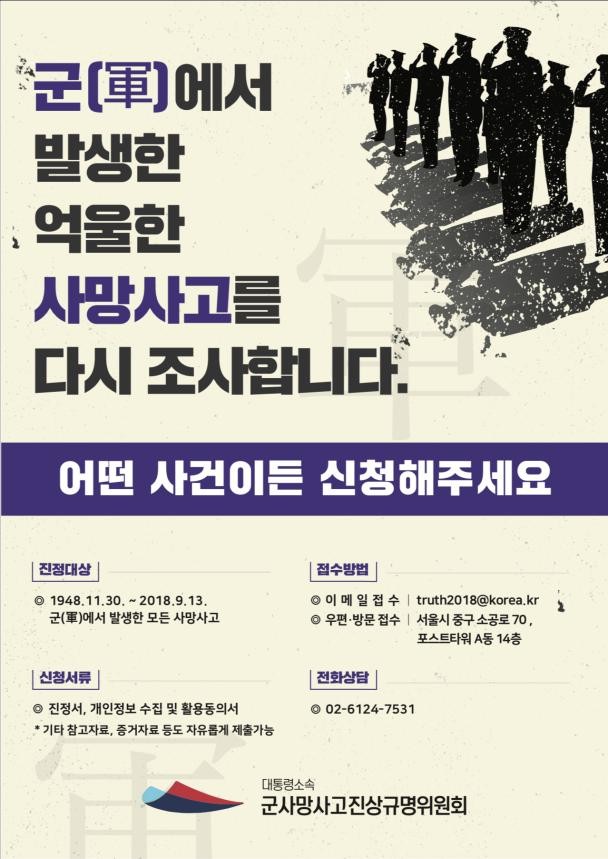 대통령소속 군사망사고진상규명위원회(이하 ’위원회’)는 군대에서 발생한 억울한 사망사고에 대해 유족과 목격자 등의 진정을 받아 공정하고 객관적인 조사로 진실을 규명하는 업무를 수행하기 위해 지난해 9월 특별법에 따라 설립됐다.
