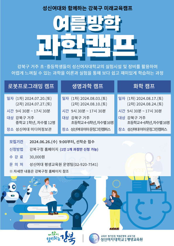 과학캠프는 7월 20일부터 8월 24일까지 6회차에 걸쳐 매주 토요일 운영된다. 운영 프로그램은 ▲로봇프로그래밍 캠프(7월 20일‧27일, 강북구 거주 중학교 1학년 대상, 차수별 12명) ▲생명과학 캠프(8월 3일‧10일, 강북구 거주 초등학교 4~6학년 대상, 차수별 16명), ▲화학 캠프(8월 17일‧24일, 강북구 거주 초등학교 4~6학년 대상, 차수별 16명) 등 3가지다.
