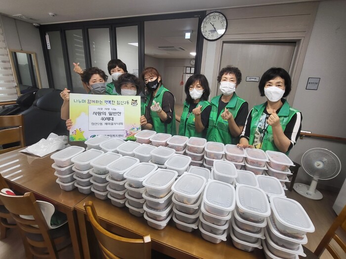 이날 새마을부녀회 회원들은 무더운 날씨에도 불구하고 제육볶음과 멸치볶음, 부추김치, 고구마줄기 볶음 등 밑반찬을 정성껏 만들어 관내 취약가구 40세대에 직접 전달하고 안부를 확인하였다.
