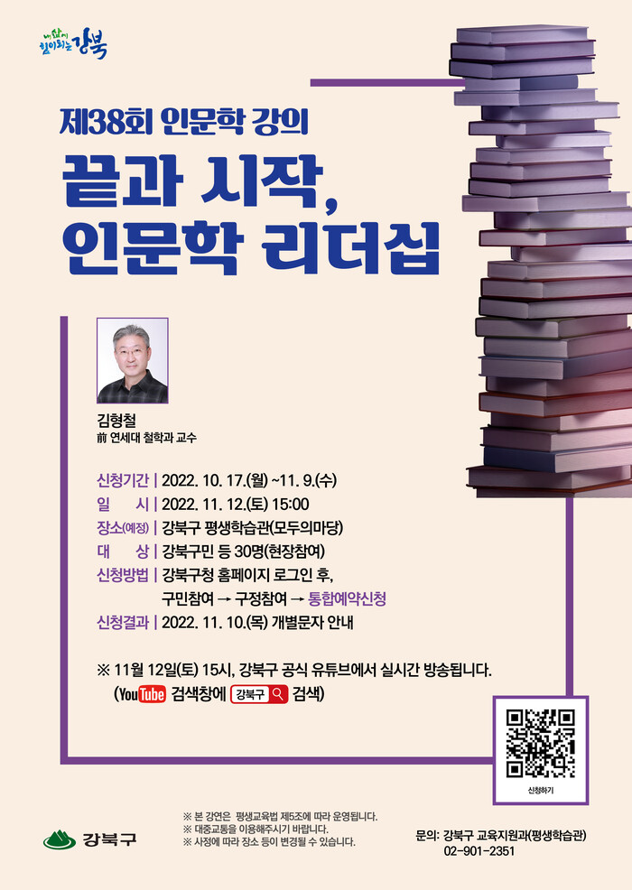 수강을 희망하는 구민은 오는 9일까지 강북구 홈페이지를 통해 신청하면 된다. 당일 현장강연에 참석하지 못하는 구민은 강북구 유튜브를 통해서도 실시간으로 시청할 수 있다.