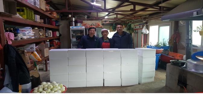 ▲초막고갈두식당은 지난 17일 황연동행정 복지센터에 직접 만든 배추김치 30상자 총 300kg을 기탁했다.(태백시 제공) |