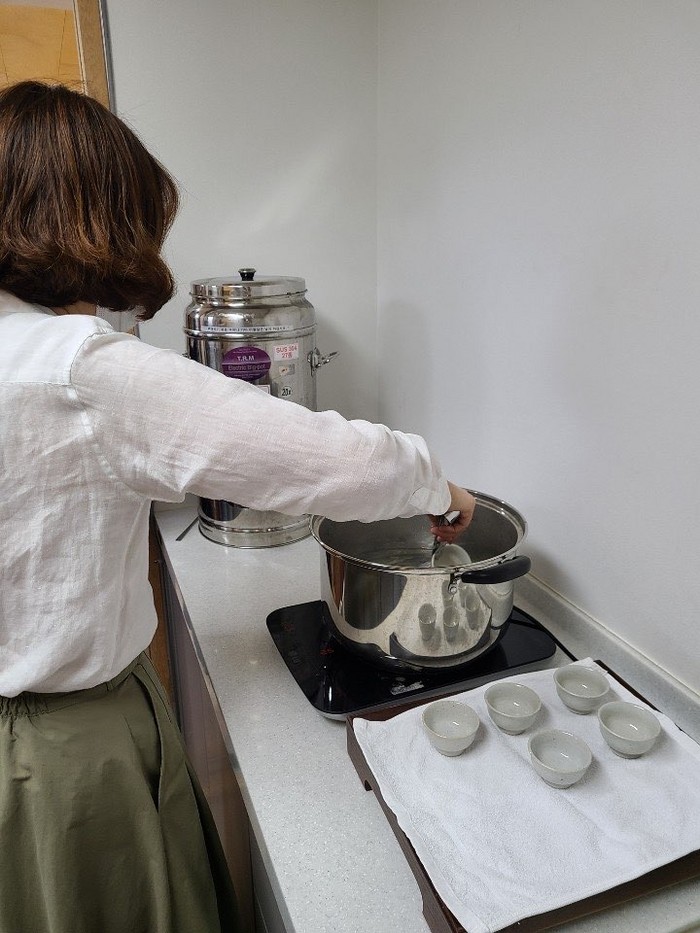 | ▲생활방역을 위해 다례 수업 전 찻잔을 열탕소독하고 있다. |