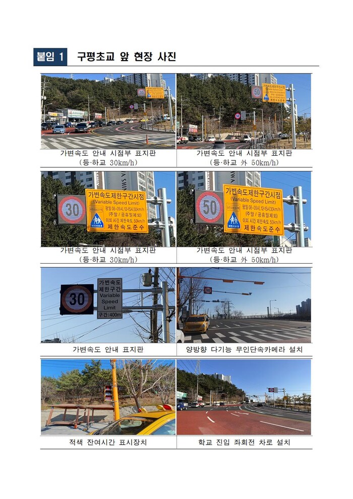이 밖에도 구평초교 앞 다기능(신호, 과속) 무인단속카메라 양방향 2대, 보행자 신호 적색 잔여시간 표시장치 등 첨단 교통시설 설치 및 어린이 통학버스가 학교에 직접 진입할 수 있도록 교통체계 개선 등 안전한 통학로를 확보하였으며, 신설된 무인교통단속장비의 경우 현재 성능검사 단계로 검사가 완료되면 적발된 과속 차량의 운전자에 대해서 향후 3개월간 계도를 할 계획이다.
