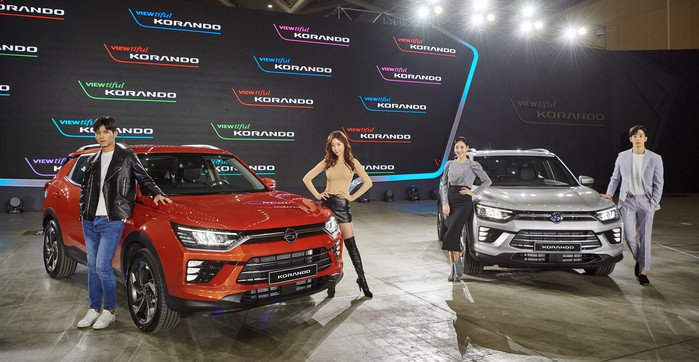▲쌍용차가 26일 신형 코란도를 공식 출시하면서 인천 송도컨벤시아에서 신차발표 및 시승행사를 열었다가 진행됐다. 사진은 코란도 옆에서 모델들이 포즈를 취하고 있다.(쌍용차 제공) |