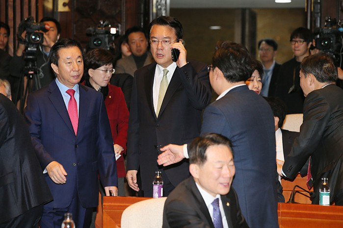 ▲1일 국회 예결위회의장에서 열린 새누리당 의원총회에 참석하기 위해 국회의원들이 입장하고 있다. 새누리당 제공. |
