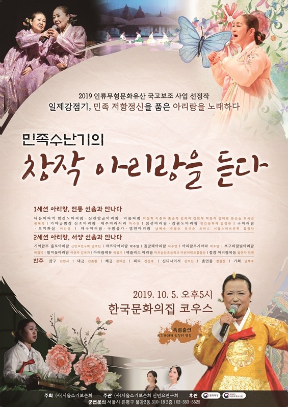 이번 공연은 국립무형유산원의 2019년 인류무형문화유산 국고 보조사업 공모 선정 작품으로 사단법인 서울소리보존회(이사장 남혜숙)가 주최하고 서울소리보존회와 신민요연구회가 주관한다.