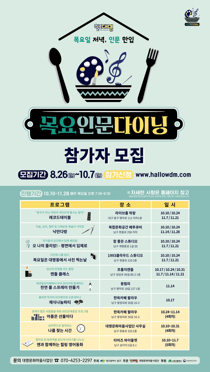 ‘할로대명 목요인문다이닝’(이하 목요인문다이닝)은 대명2·3동 일대에서 저녁식사를 하며 한 가지 주제를 두고 소통‧체험하는 프로그램으로, 대구시와 문화체육관광부의 후원을 받아 남구청 주최, 대명문화마을 사업단(할로대명) 주관으로 열린다.