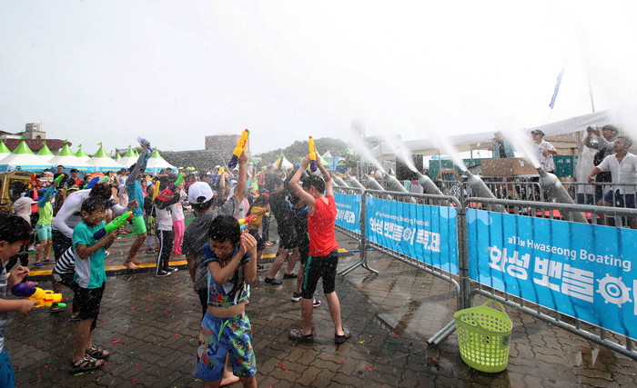 | ▲뱃놀이 축제 물놀이장에 뿌려지고 있는 물대포 모습. |
