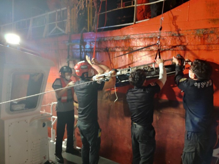 | ▲부산경찰이 지난 21일 밤 목섬 인근을 항해하던 선박에서 발생한 응급환자를 긴급 이송하고 있다.(부산해경 제공) |