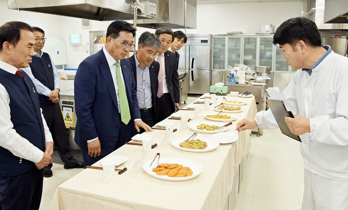 ▲ ㈜사옹원 현장 방문사진. 한국농수산식품유통공사 김춘진 사장(좌측3번째) |