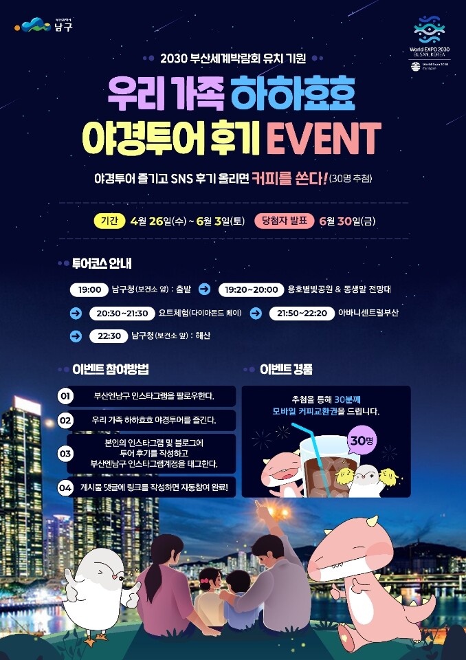 [로컬세계 부산=맹화찬 기자]부산시 남구는 5월 가정의 달 가족 이벤트로 우리가족 '하하효효 야경투어'와 '해설사 함께하는 AR 다이노투어'를 운영한다고 27일 밝혔다.