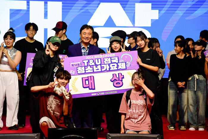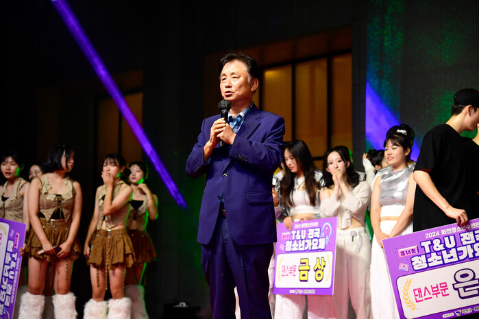 ▲ 최문순 군수가 제14회 T&U 전국 청소년 가요제 시상식에서 참가자들을 격려하고 있다. |