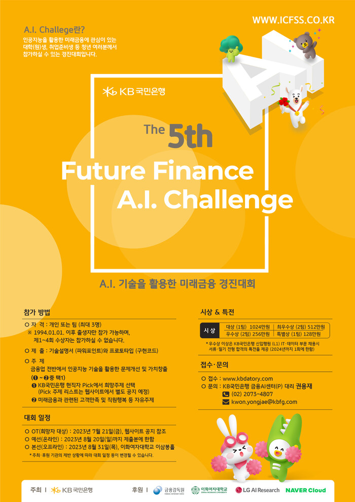KB국민은행(은행장 이재근)은 제5회 ‘Future Finance A.I. Challenge’를 개최한다고 밝혔다.