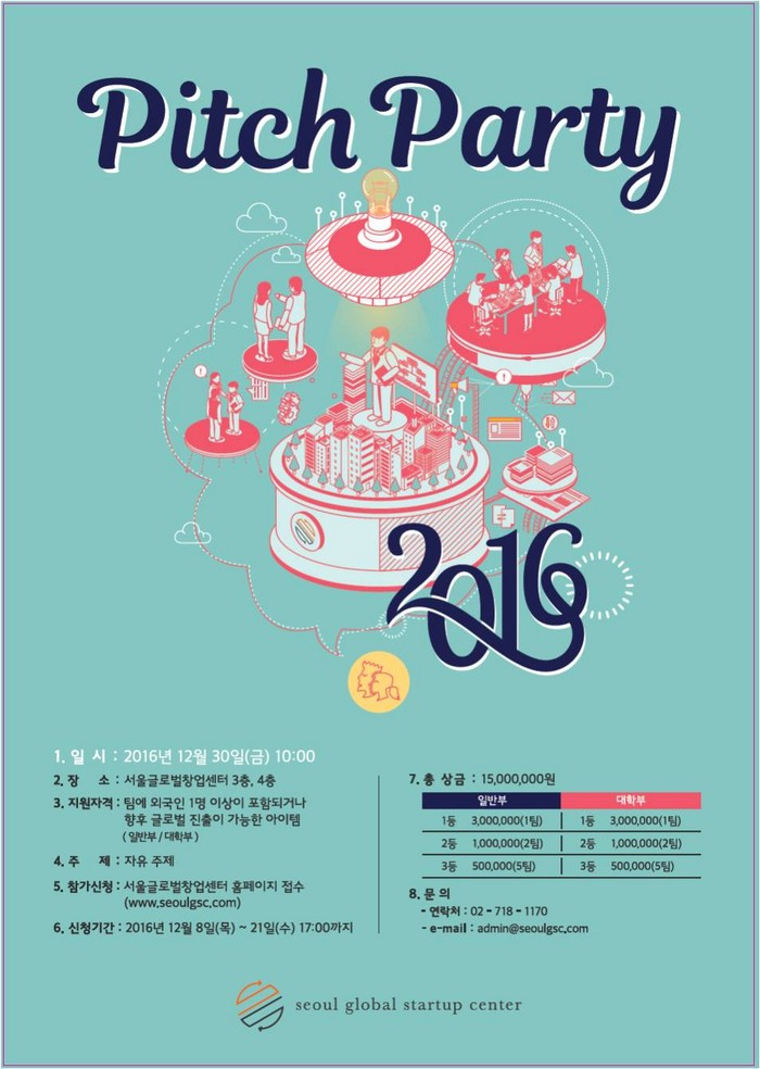 [로컬세계 박민 기자]서울시는 서울글로벌창업센터에서 참신한 창업 아이템을 가진 예비창업자와 스타트업을 대상으로 투자유치 기회를 제공하는 제1회 서울 글로벌 창업센터 창업경진대회 (Pitch Party 2016)를 오는 30일 개최한다고 밝혔다.