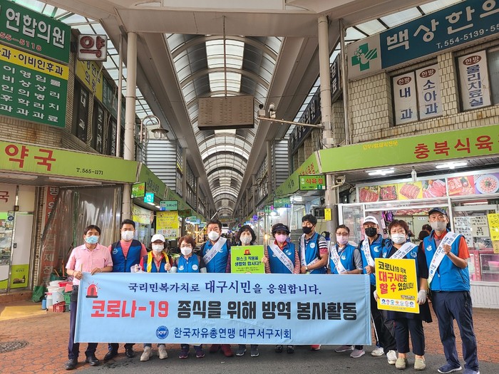 [로컬세계 박세환 기자]대구 서구청은 자유총연맹 서구지회(지회장 황영준)와 함께 지난 5일 관내 전통시장과 어린이공원에서 대구 FOR YOU 운동 일환으로 코로나19 생활방역 봉사활동을 실시했다고 8일 밝혔다.